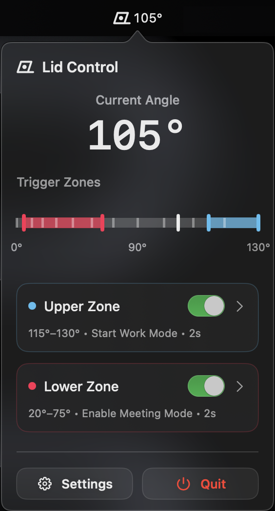 Set upper and lower MacBook lid-angle zones to run Apple Shortcuts instantly. A lightweight macOS menu bar app with two trigger zones.
